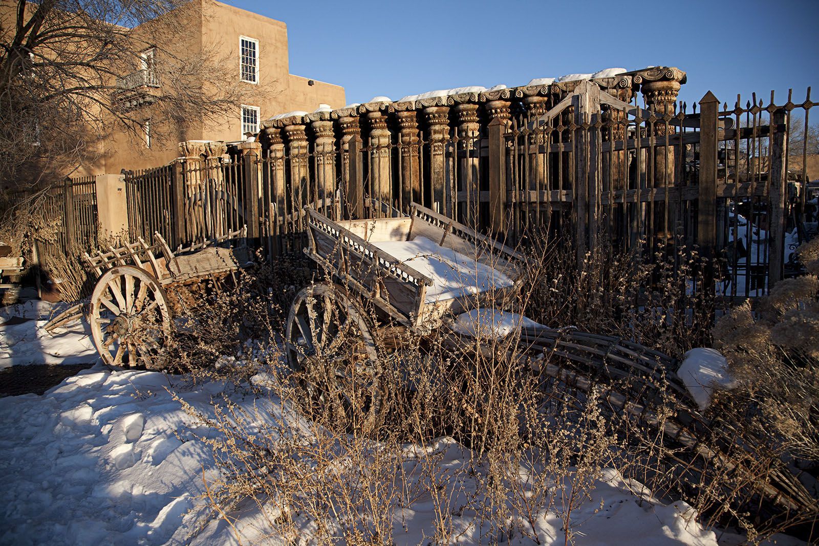 Old abandoned stagecoach in Santa Fe in winter